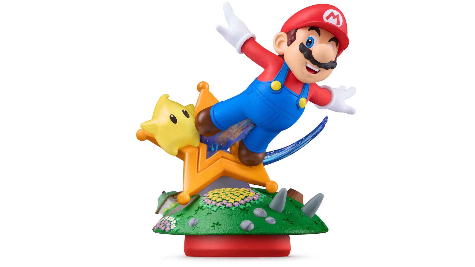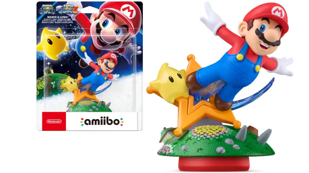 Aceasta figurina amiibo este mai mare decat dimensiunea standard si il prezinta pe Mario zburand in spatiu, cu un companion Luma care il urmeaza indeaproape.
