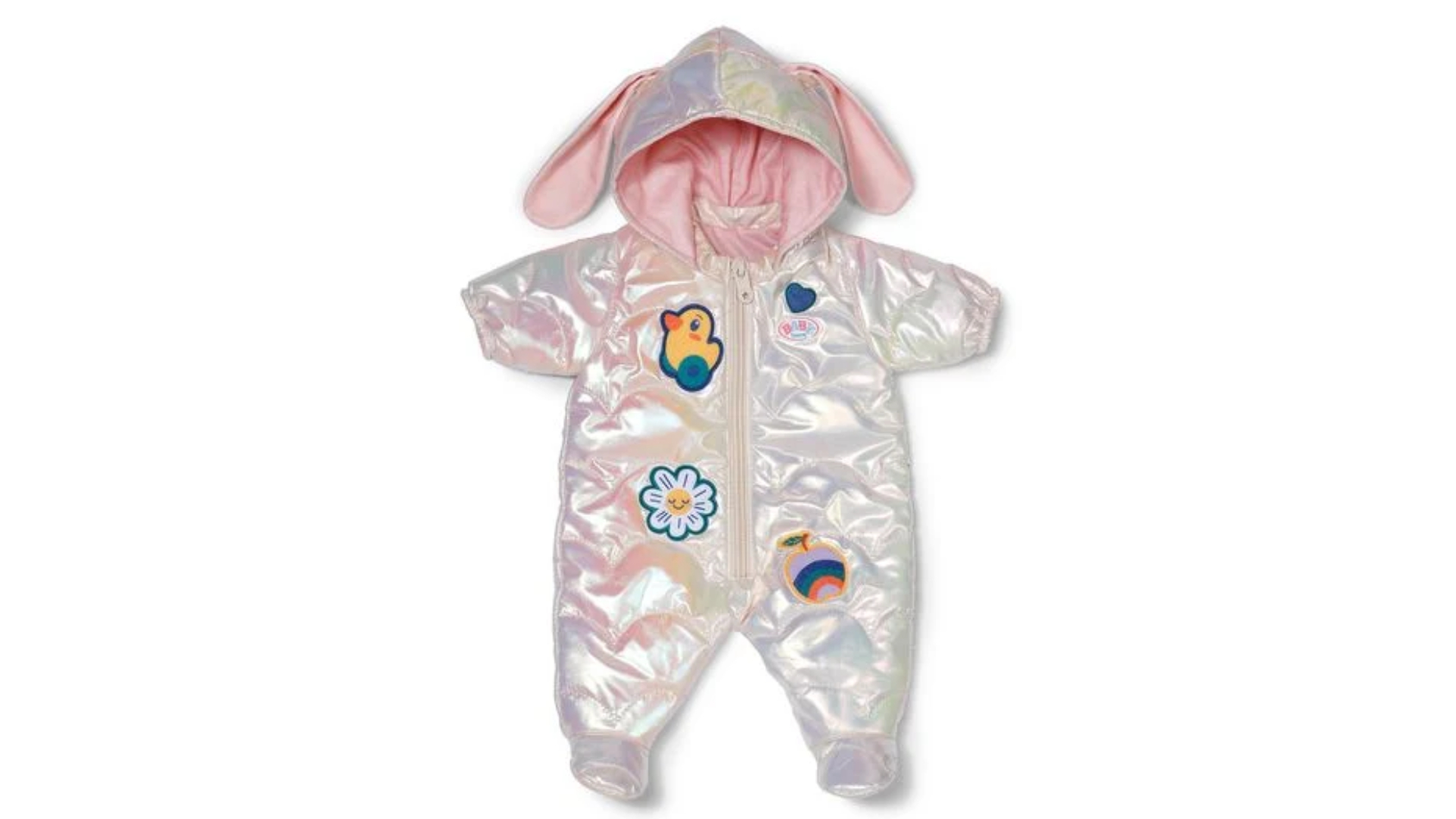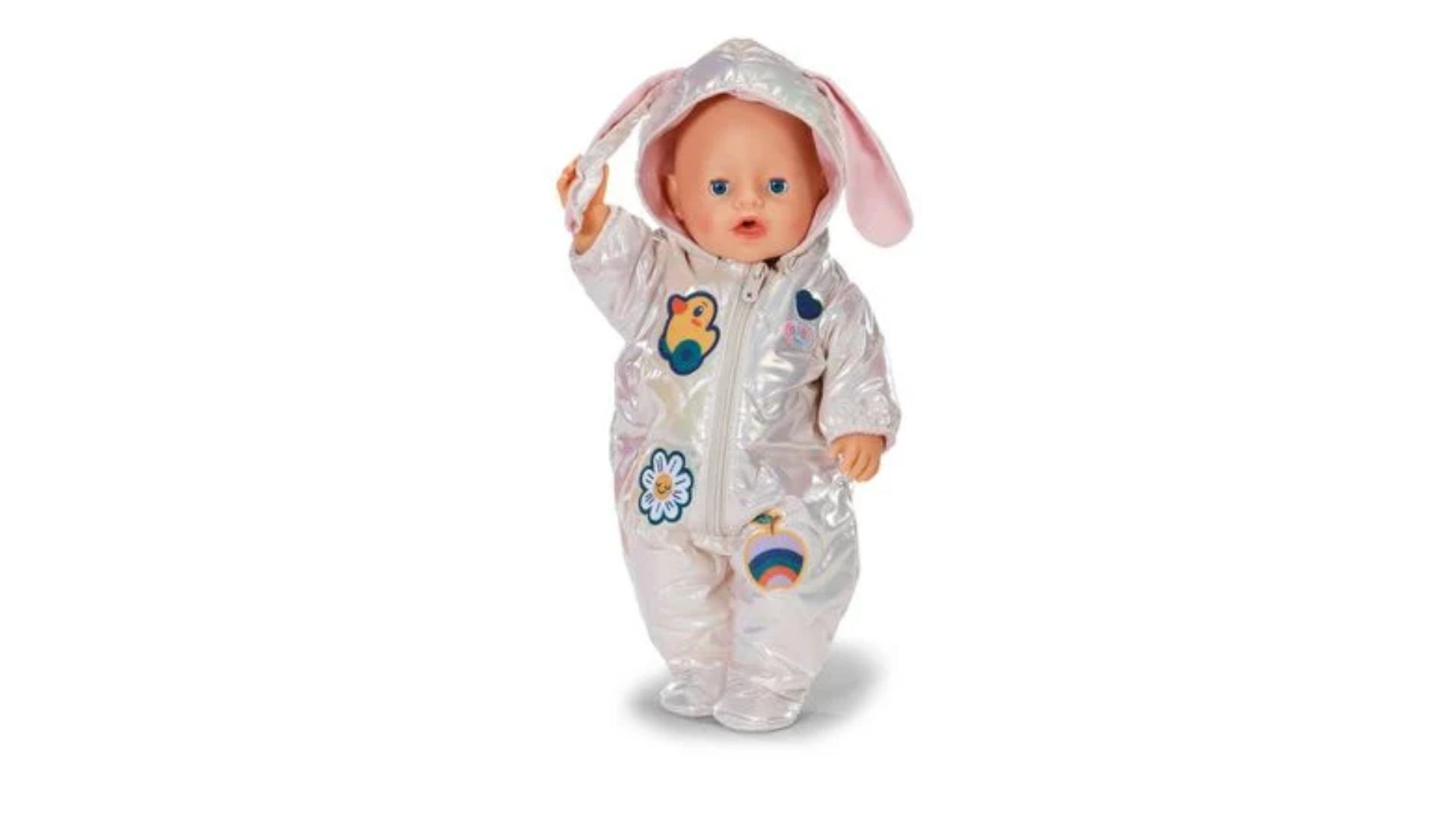 Un superb costum de zăpadă crem, cu fermoar, cu urechi adorabile de iepuraș pe glugă și petice cusute cool, BABY born poate sta la cald în timp ce se joacă afară!