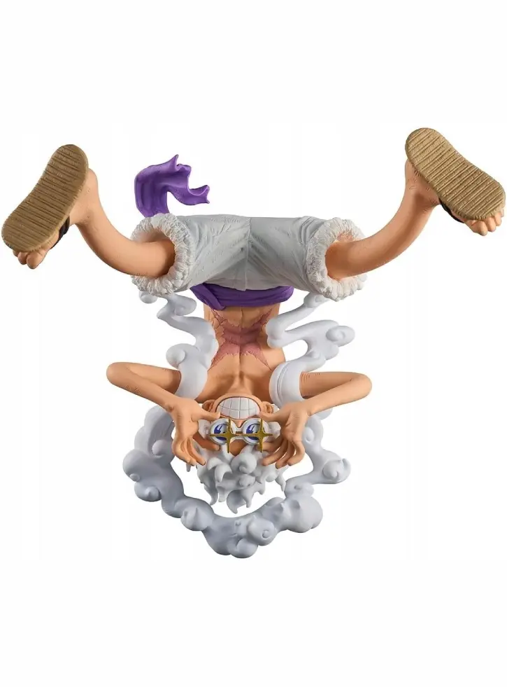 El stă în echilibru pe cap cu un zâmbet încrezător, sculptat meticulos în detalii complexe, mânuind Gear 5 ca un campion.