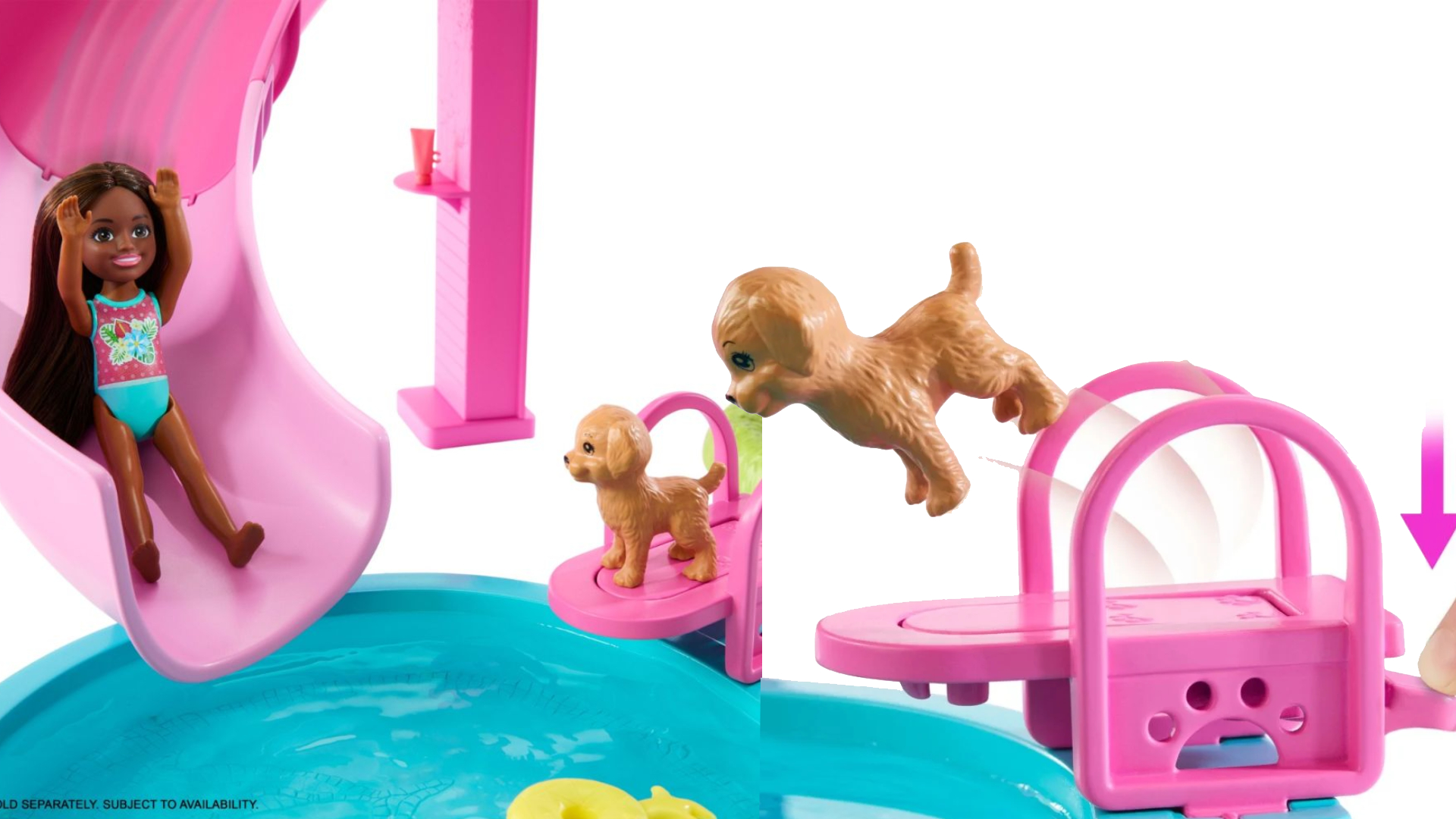 Trimite papusa Barbie (vanduta separat) pe tobogan, las-o sa se relaxeze pe sezlongul gonflabil si roteste masa pivotanta pentru o gustare delicioasa!