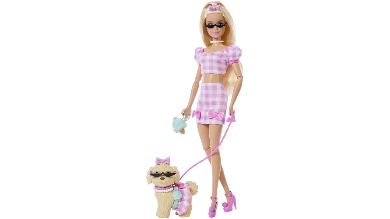 Barbie si catelusul ei sunt gata sa atraga toate privirile cu tinutele lor asortate! Accesoriile precum ochelarii de soare, colierul si poseta completeaza perfect look-ul modern.