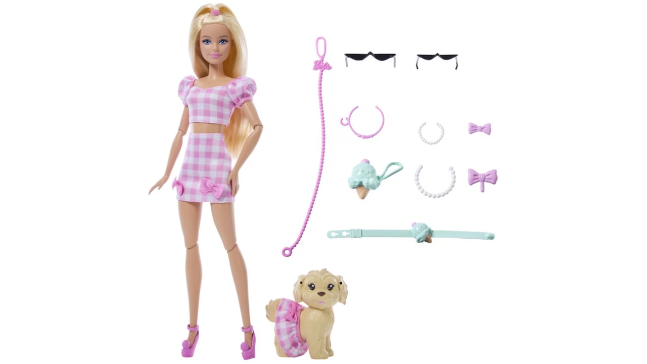 Cu un set de accesorii coordonate atât pentru Barbie, cât și pentru câinele ei, copiii pot stiliza perechea în ținute de geamăt din cap până în picioare!