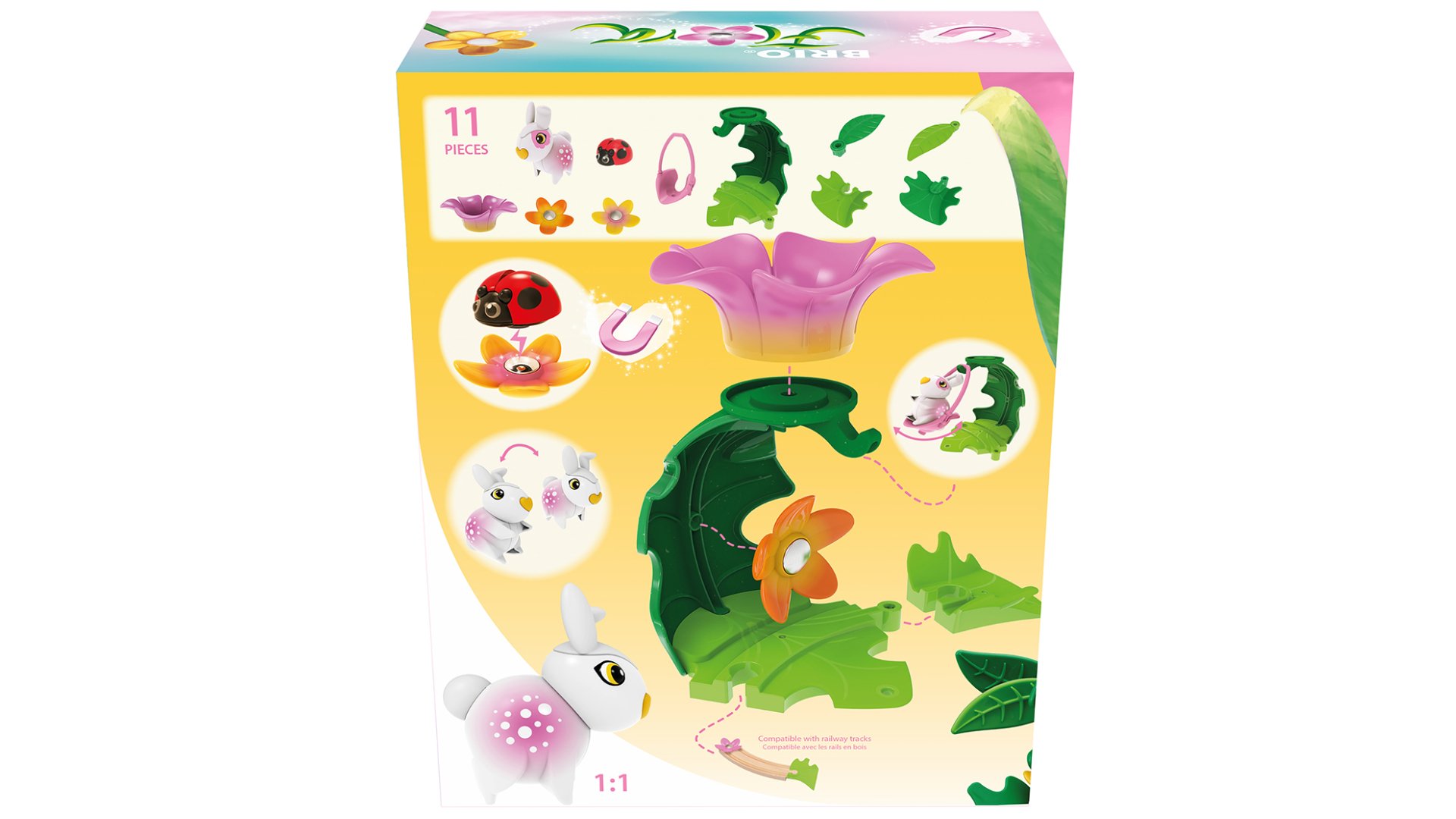 Acest set de joacă luminos include un scaun leagăn pentru flori, un ascunzător rotativ pentru flori, potrivit pentru o prietenă buburuză, și frunze ușor de îmbinat pentru amenajări imaginative.