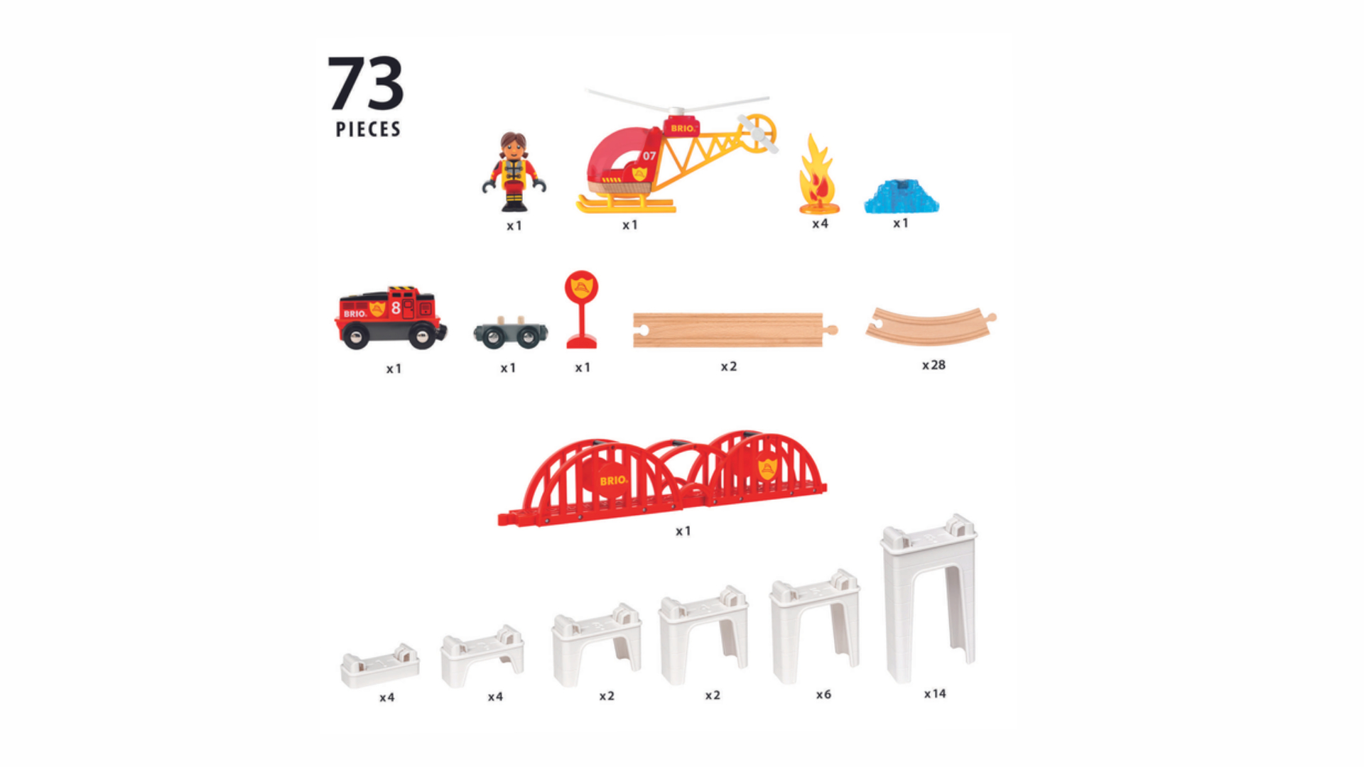 Setul Mega Spiral 36114 conține 73 de piese: 32 de suporturi modulare, 30 de șine din lemn, 1 pod lung roșu, 1 locomotivă, 2 vagoane de marfă, 1 camion cu apă, 1 elicopter, 1 figurină de pompier, 4 accesorii pentru pompieri, 1 semn de intervenție a pompierilor.