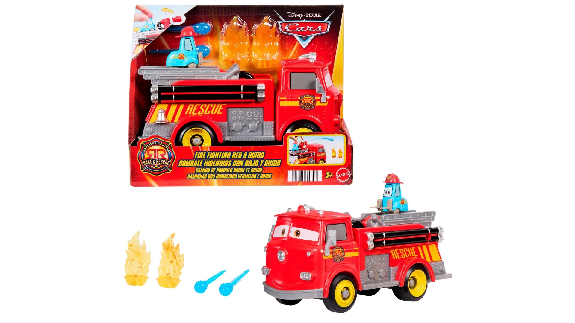Alătură-te misiunilor de salvare pline de acțiune cu camionul de pompieri Mattel Disney și Pixar Cars Radiator Springs Race & Rescue cu Red și Guido!
