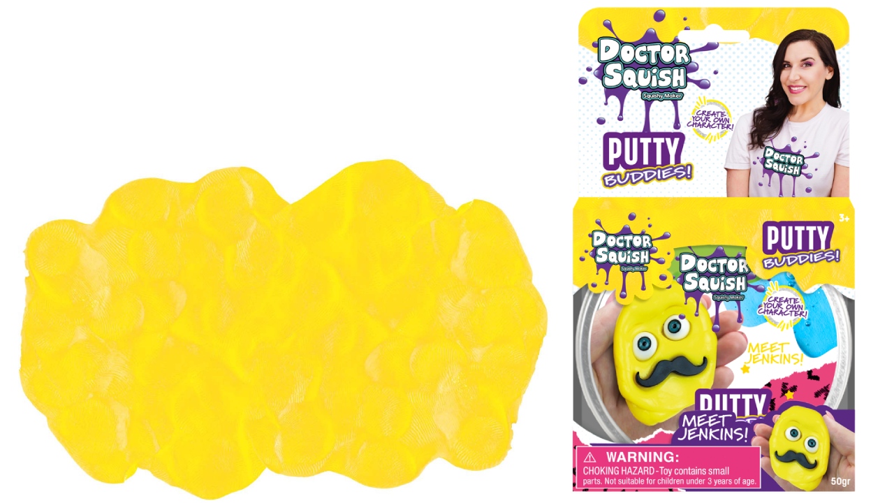 Dezvolta creativitatea și intrați în lumea colorată a Doctor Squish cu Jenkins -Galben cu Putty Buddies 50 g.