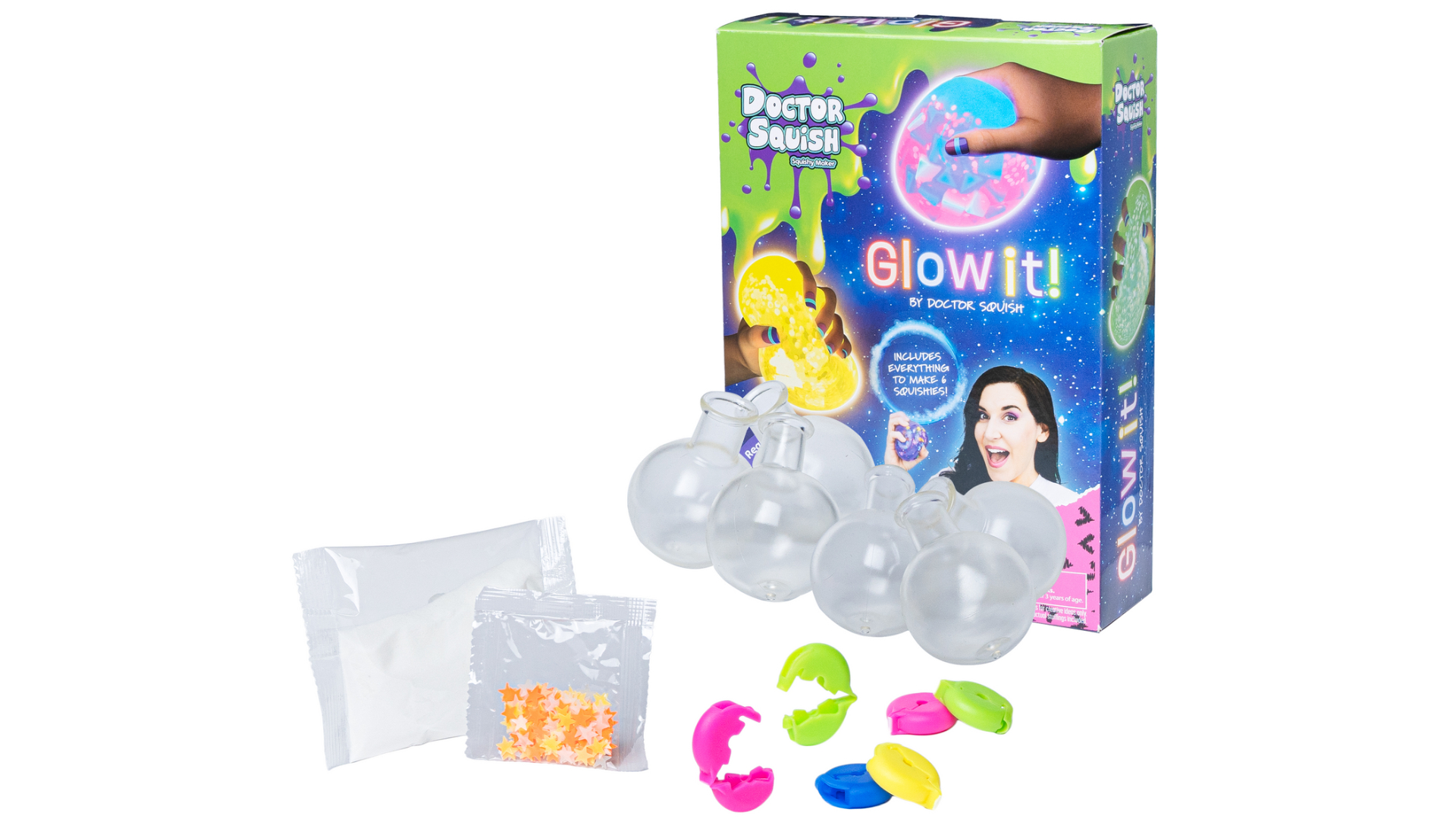 Perfect pentru copiii, acest kit include 6 jucării pufoase transparente, 6 cleme colorate reutilizabile, decorațiuni care strălucesc în întuneric și pudră de slime.