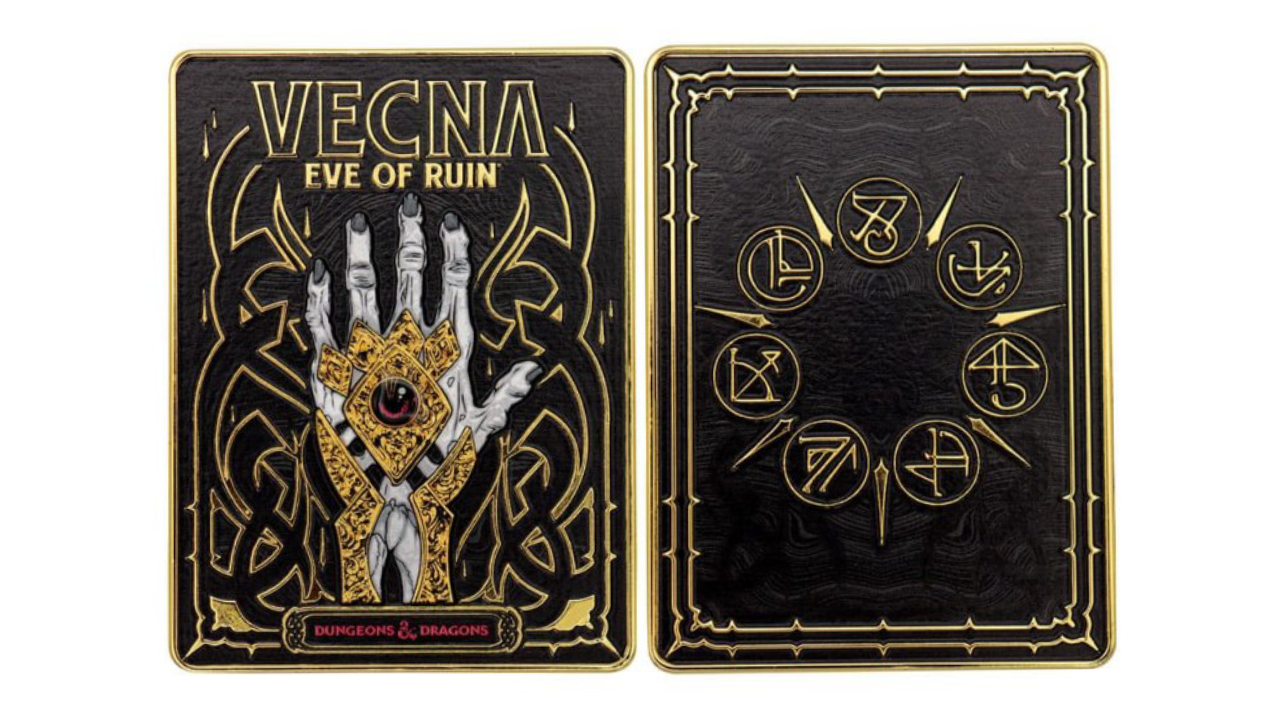 Cu mâna infamă a lui Vecna puternic reliefată pe fața sa, acest lingou metalic de colecție este finisat cu detalii din aur antic și email negru.