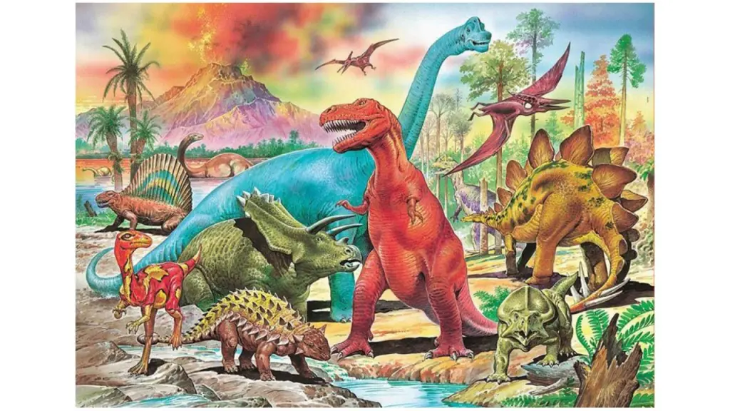 Ilustrația prezintă diferite specii de dinozauri într-un peisaj preistoric plin de culoare și detalii captivante.