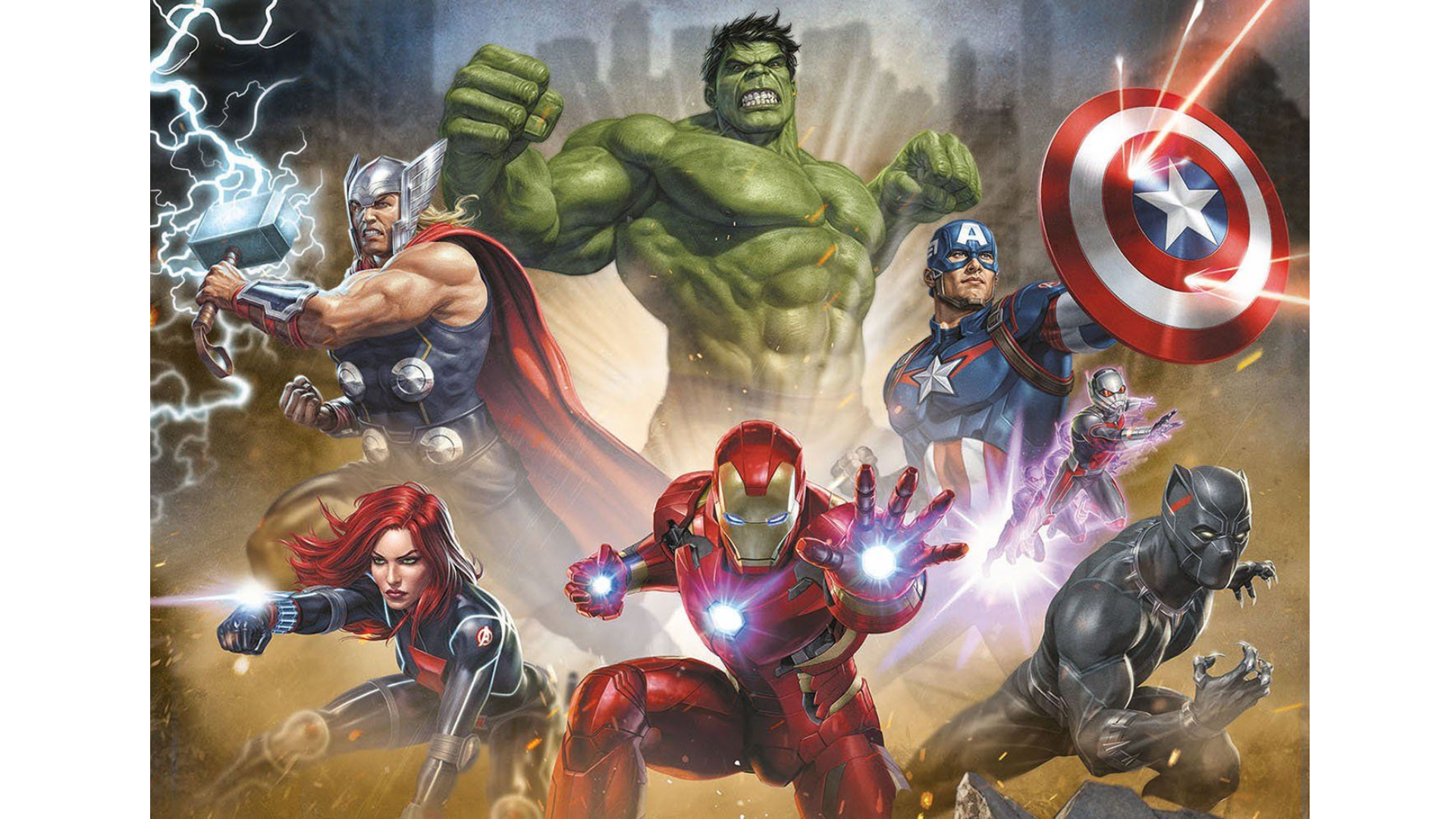 Ilustrația îi prezintă pe eroii emblematici din The Avengers, într-o scenă plină de acțiune și energie.