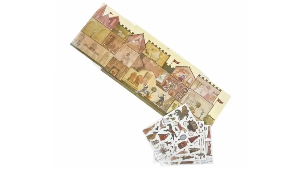 Această carte magnetică pliabilă îi permite copilului tău să creeze povești atât în interiorul, cât și în exteriorul castelului.