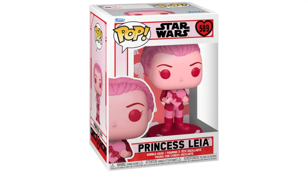 Fiecare personaj ține în mână o cutie în formă de inimă și se află deasupra unei baze Star Wars roz adorată cu un mesaj de Sfântul Valentin inspirat de personaj.