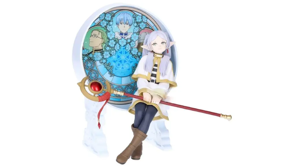 Frieren este prezentata intr-o postură elegantă, calmă, care exprimă introspecție și melancolie – în ton cu tema anime-ului.
