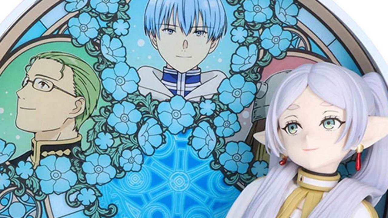 Baza decorativă sub forma unui vitraj cu portrete si elemente simbolice din universul anime‑ului “Frieren: Beyond Journey’s End”, nu este doar suport fizic, ci contribuie estetic la povestea figurinei.