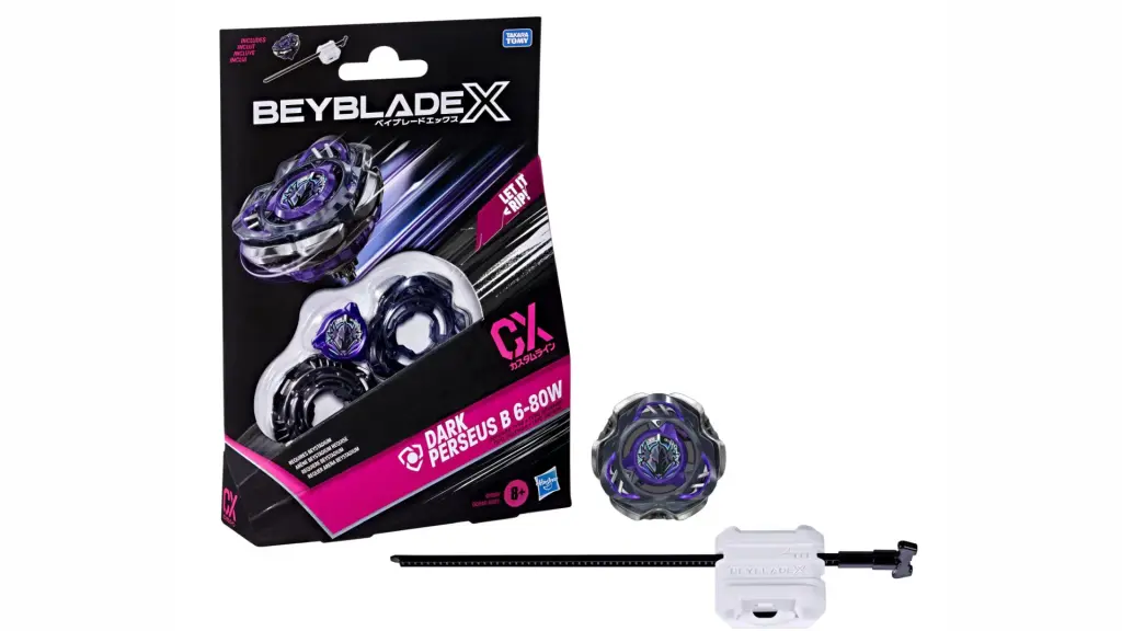 Experimentati emotia urmatoarei generatii de stadioane, lansatoare si varfuri Beyblade: Beyblade X cu Pachetul de pornire Beyblade X Dark Perseus B 6-80W, care include 1 blat si lansator Balance Type care se roteste in dreapta (necesar Beystadium, vandut separat).