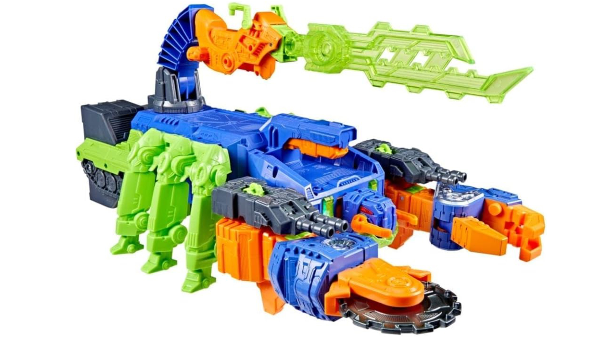 Transformers în multe moduri diferite: există un braț detașabil în formă de fierăstrău circular care devine o motocicletă plutitoare, un braț în formă de gheară gata să prindă orice (sau pe oricine) îi stă în cale, o coadă detașabilă care devine o sabie și 2 stații de luptă în piept și picioare.