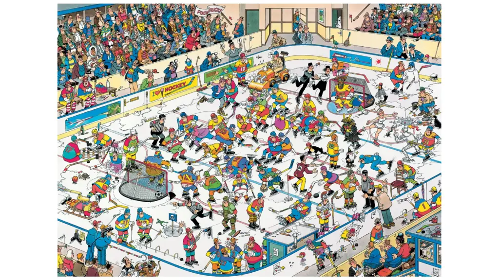 Puneți-vă patinele și pregătiți-vă pentru o scufundare amuzantă în cel mai haotic joc de hochei pe care l-ați văzut vreodată cu puzzle-ul Jan van Haasteren „Hochei pe gheață” cu 1000 de piese.