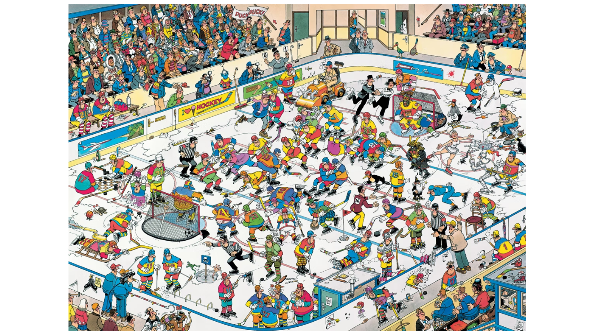 Pe măsură ce asamblați patinoarul, tribunele și jucătorii, veți începe să observați personajele iconice, recurente, care sunt semnul distinctiv al fiecărui puzzle JvH.
