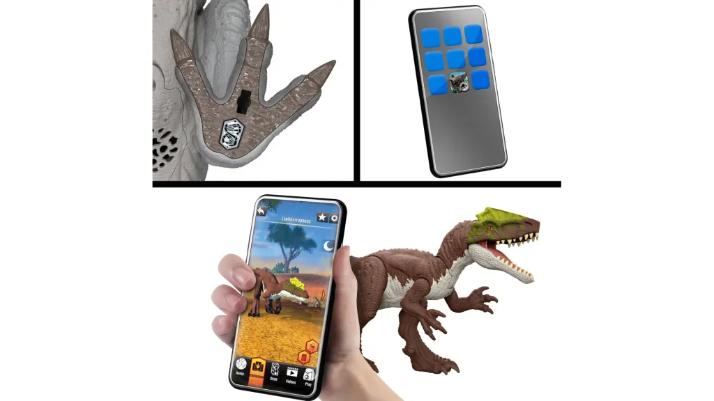 Scanați codul de urmărire de pe piciorul dinozaurului cu aplicația gratuită Jurassic World Play pe un dispozitiv compatibil (Android sau iOS, nu este inclus) pentru a accesa o versiune digitală a dinozaurului și a juca jocul său distractiv. Culorile și modelele pot varia.