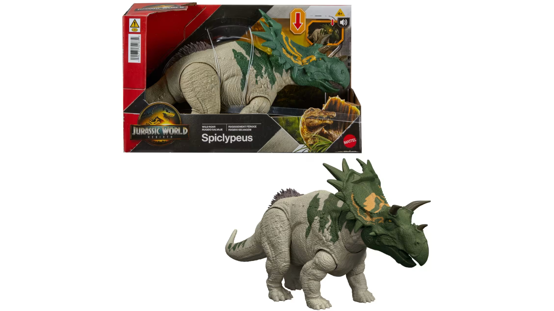 Jurassic World Rebirth Wild Roar Spiclypeus este o figurină de dinozaur inspirată din universul Jurassic World, creată pentru joacă interactivă.