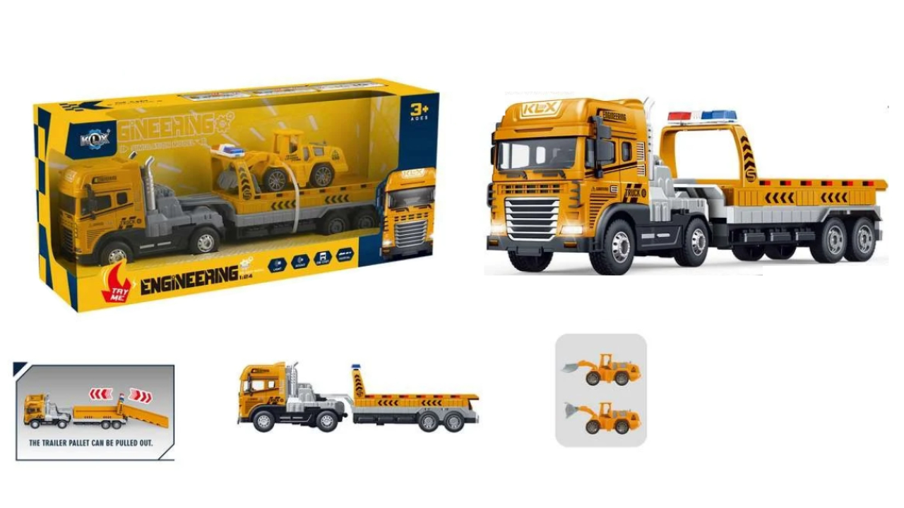 Acest set conține un camion robust cu o remorcă detașabilă, construită cu măiestrie pentru a transporta un buldozer puternic.