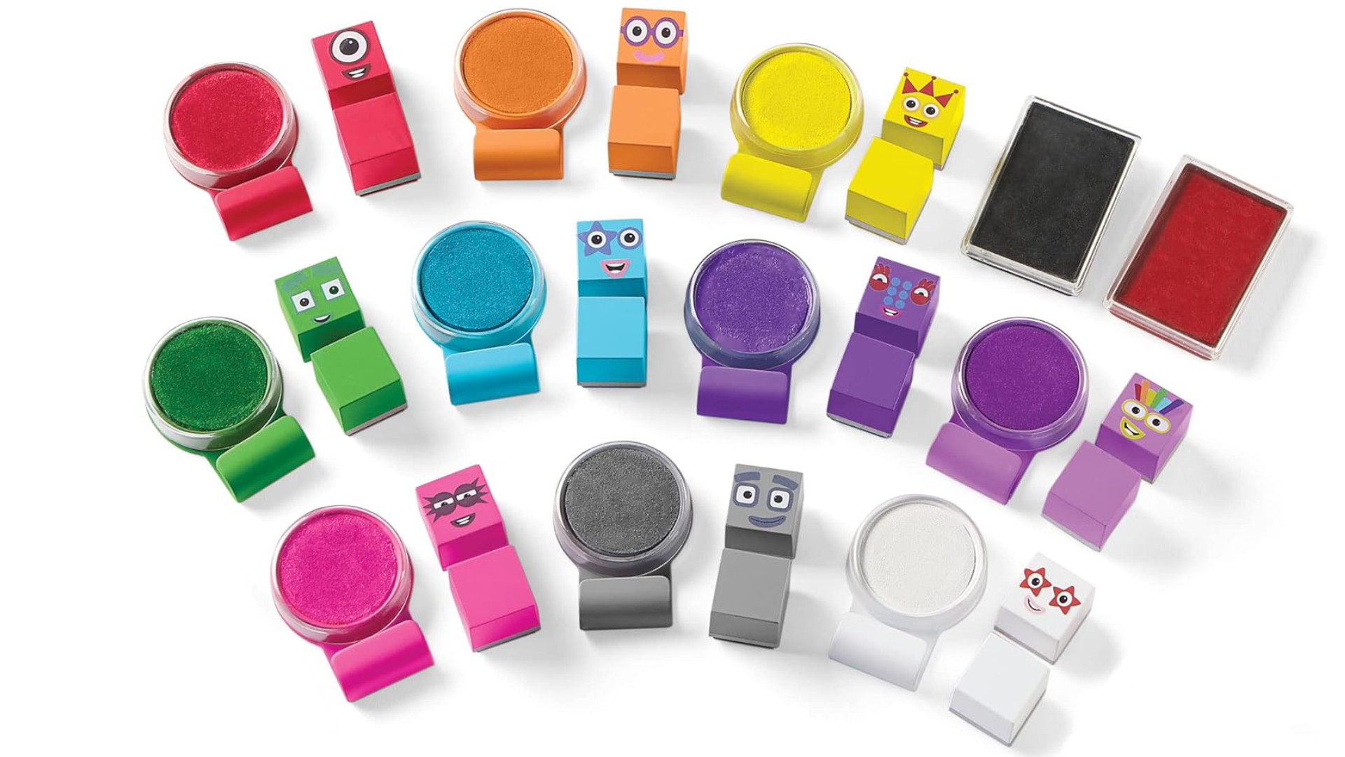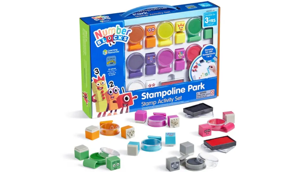 Cu ștampilele reutilizabile și cernelurile lavabile din setul de activități Numberblocks Stampoline Park de la Learning Resources.