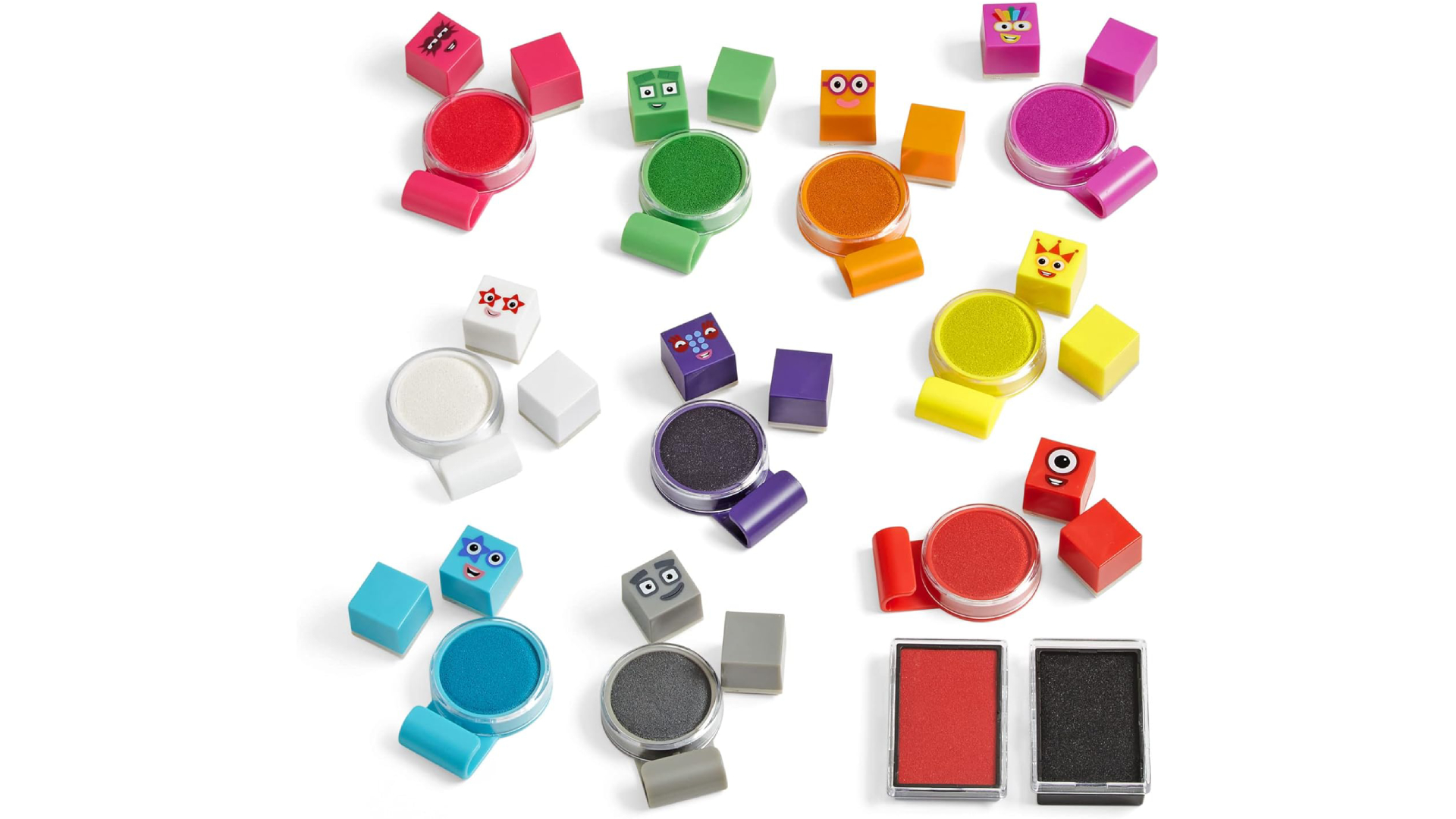 Acest set de activități cu 32 de piese include 12 tampoane de cerneală, 10 în culorile unice ale Numberblocks și 2 tampoane de cerneală mari (roșu și negru) pentru realizarea trăsăturilor faciale.