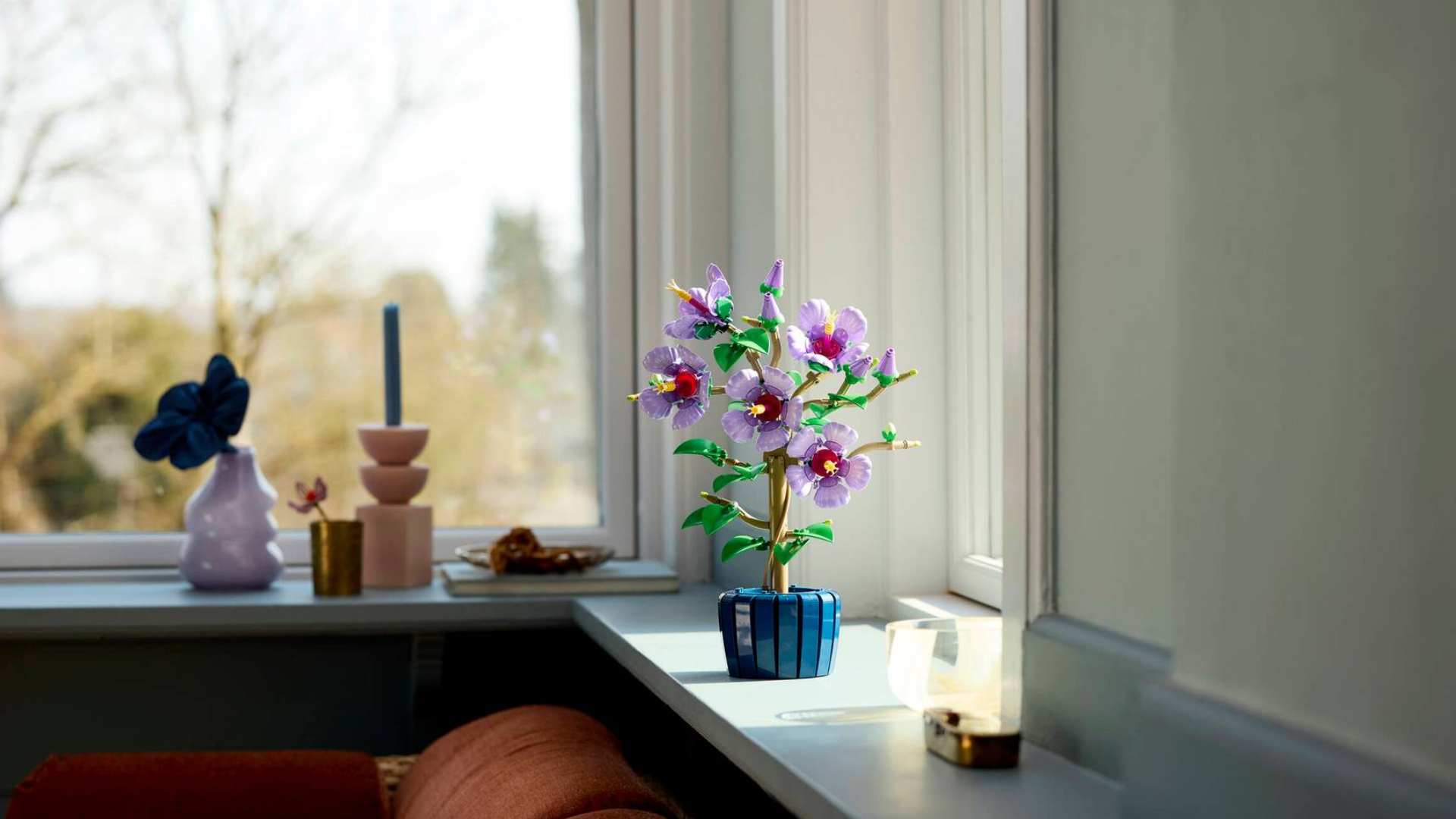 Setul de construcție vine cu un ghiveci albastru închis pentru un decor elegant.