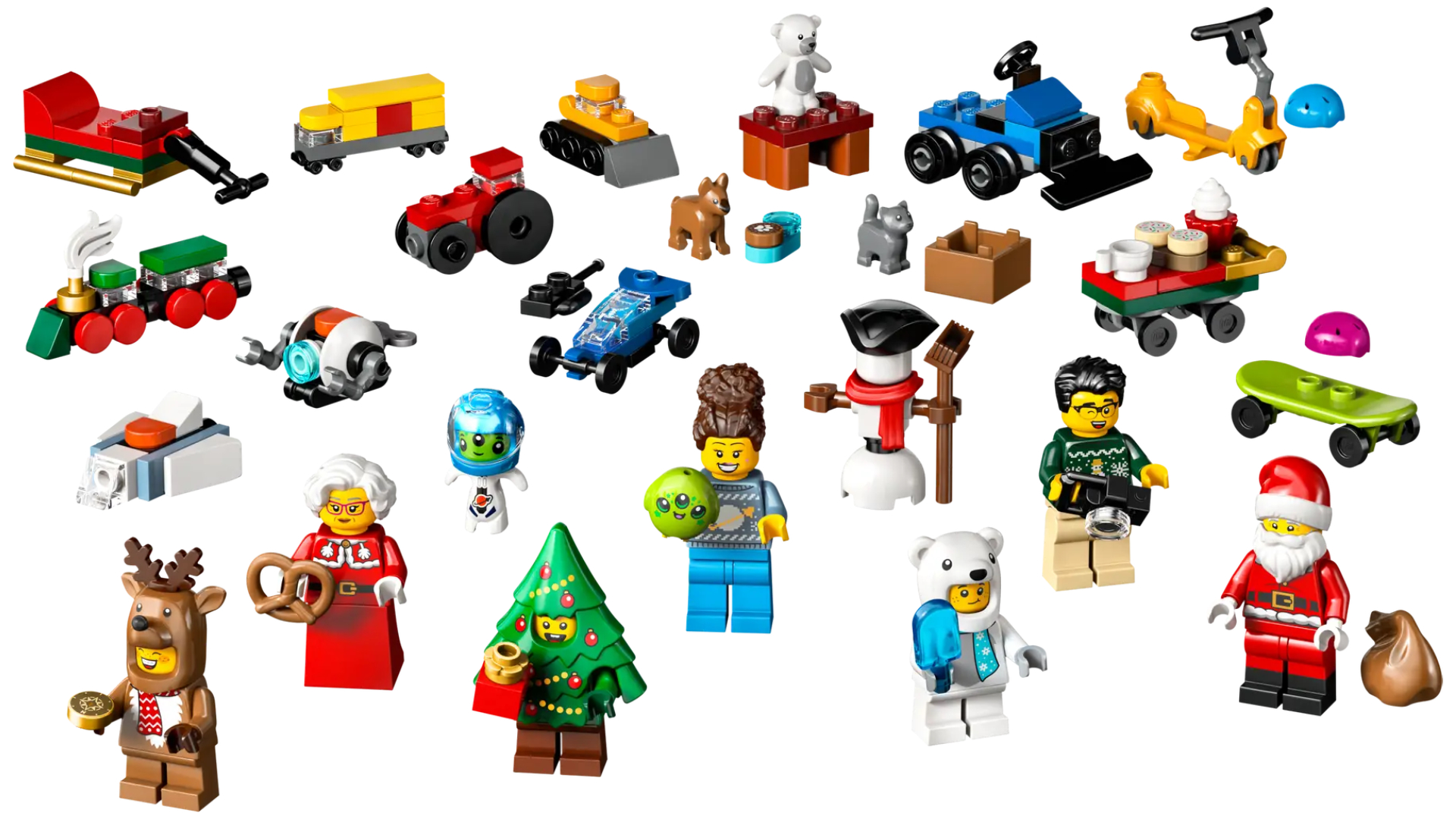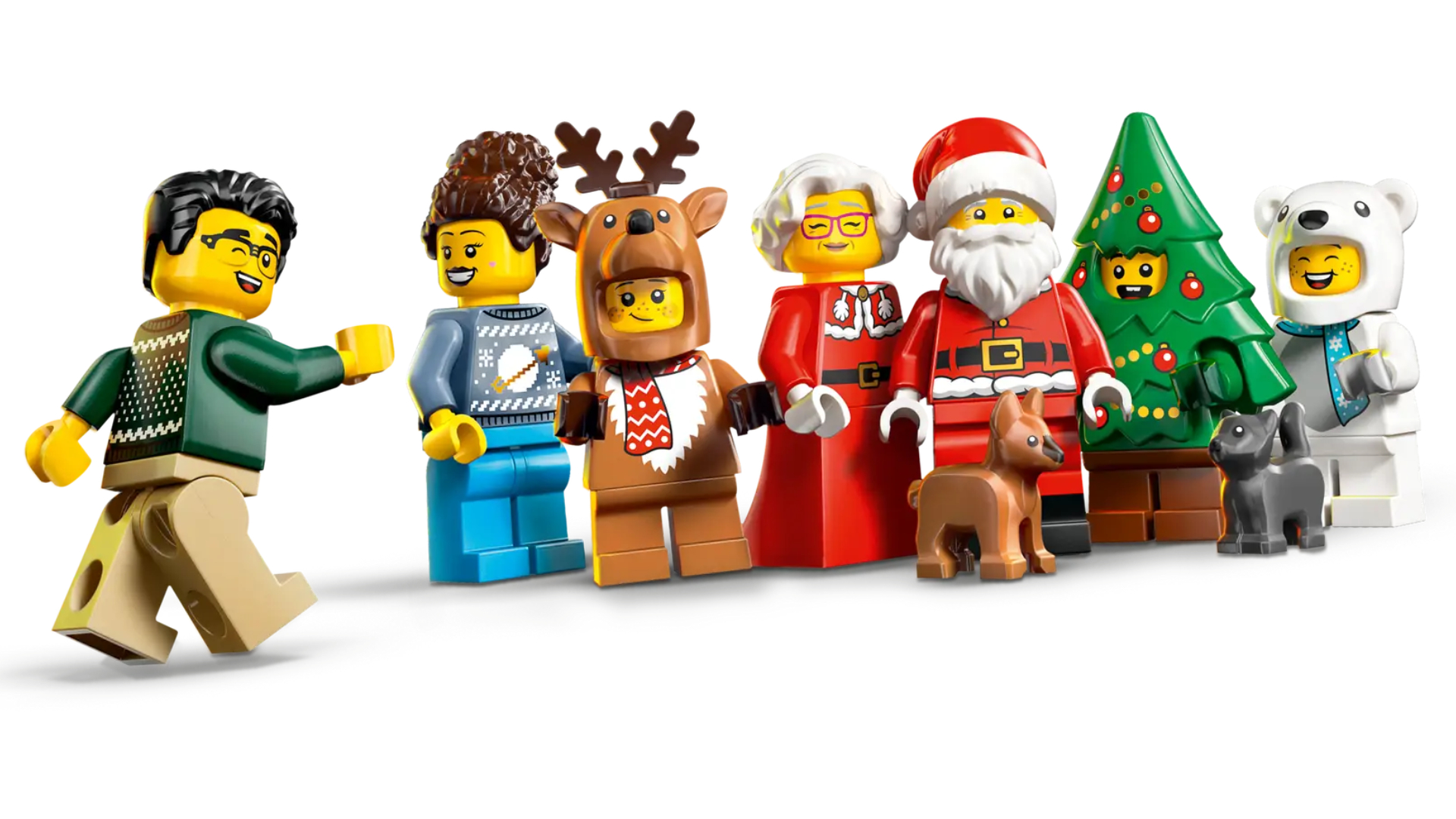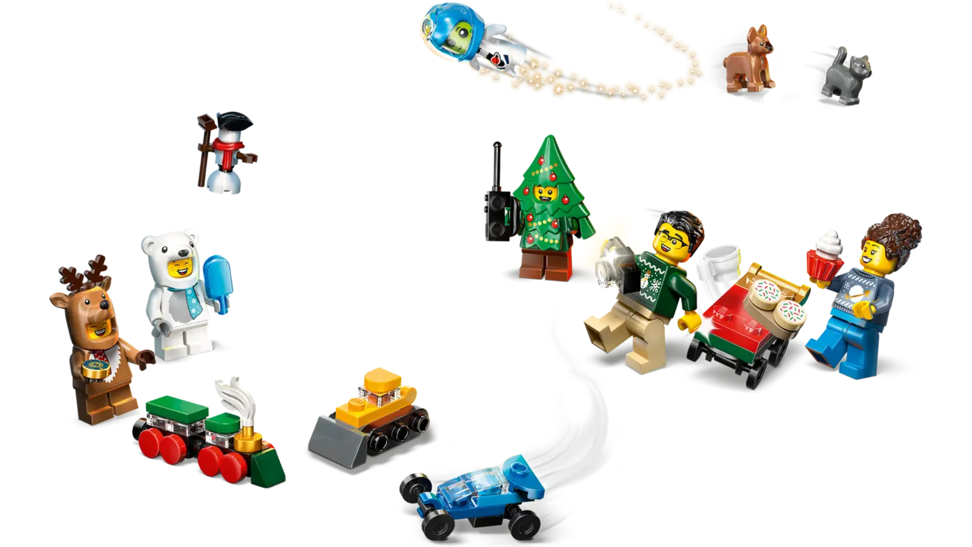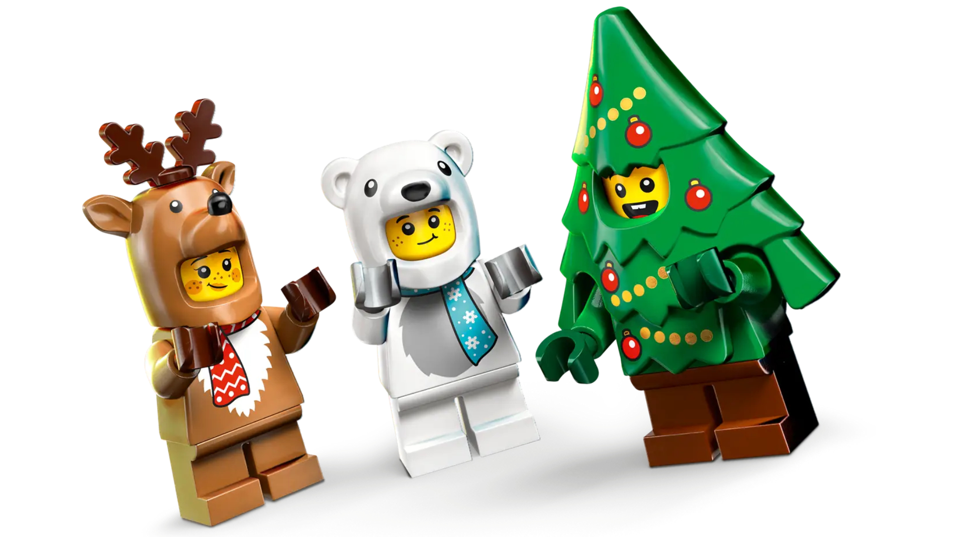 Calendarul din acest an aduce multa distractie festiva, incluzand personaje costumate in urs polar, ren si brad de Craciun, plus accesorii si miniconstructii.