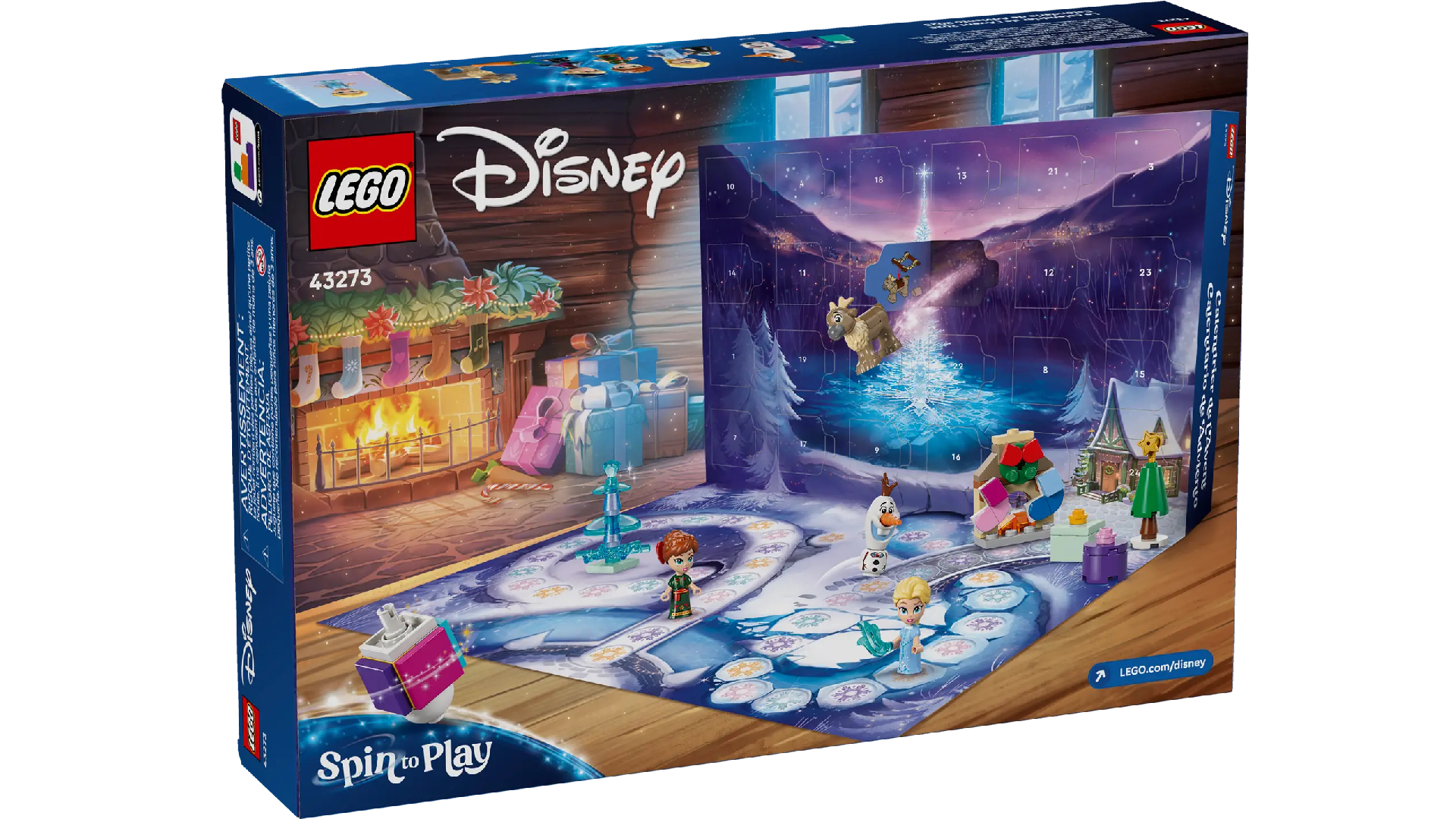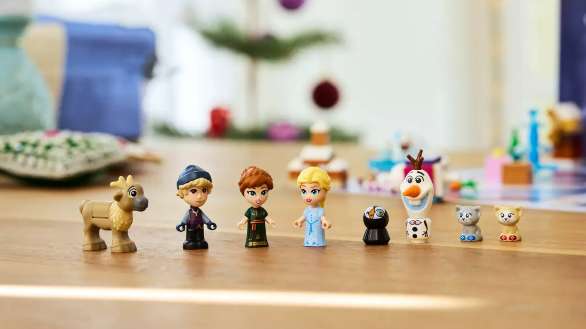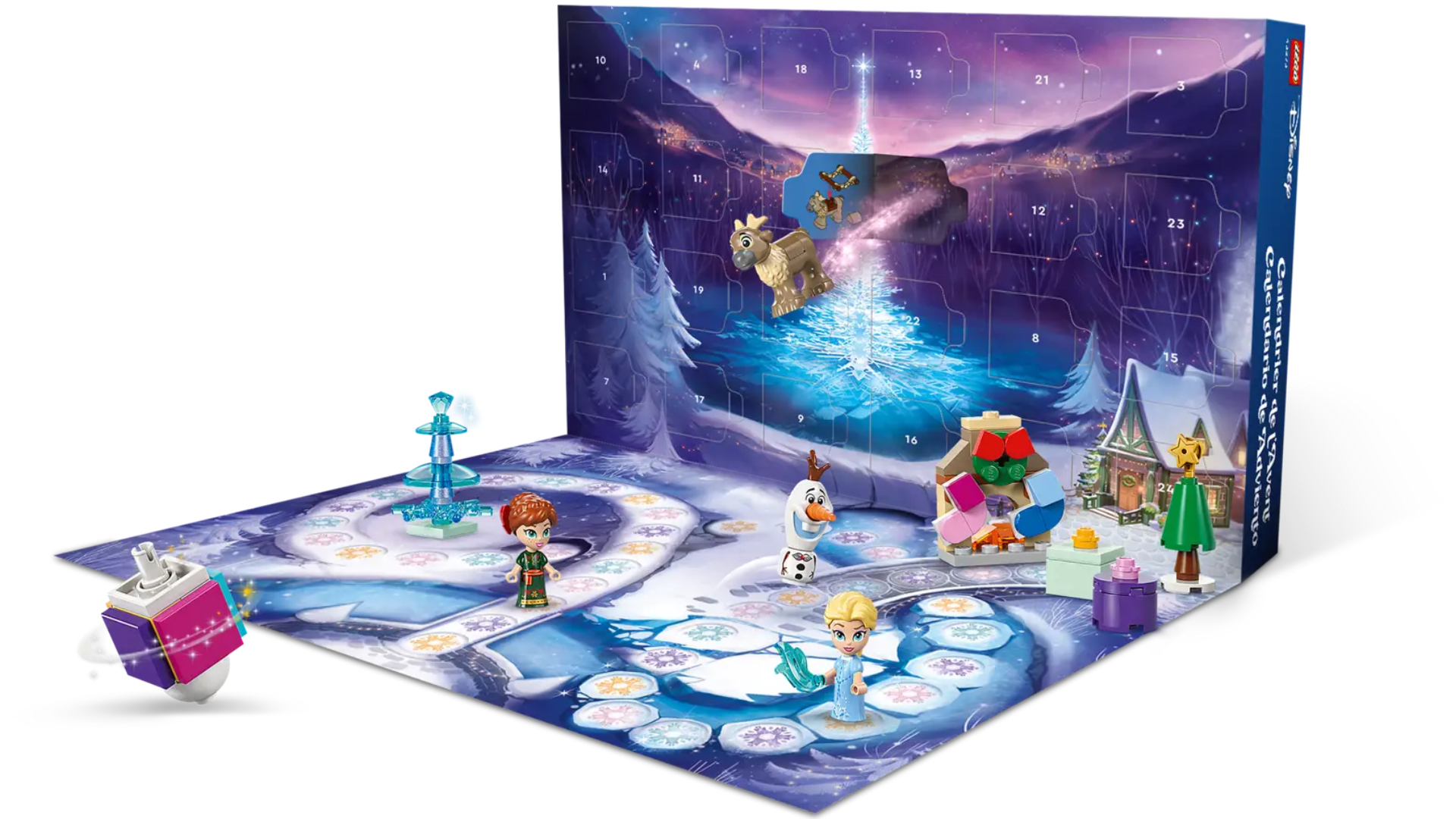 Calendarul de Advent conține personajele LEGO Disney Elsa, Anna, Kristoff, Olaf și Sven, 2 personaje LEGO Disney pisoi, un mini Castel Arendelle și un copac cu cristale de gheață.