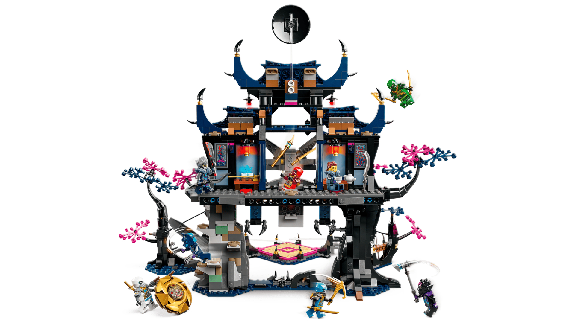 Setul de construcție dojo cu 2 niveluri include o curte unde personajele se pot angaja în lupte aeriene la capătul unor bețe mobile transparente.