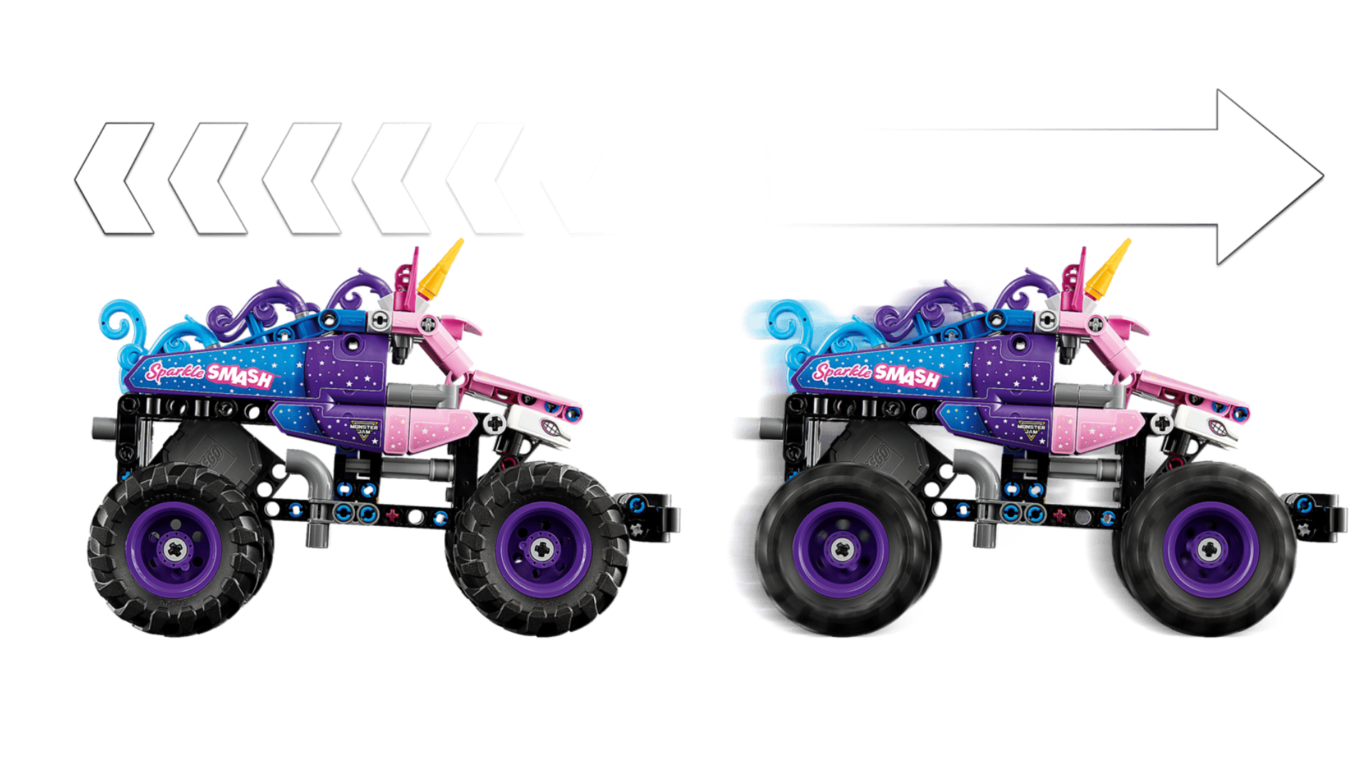 Folosește funcția de tracțiune spate pentru a trimite camionul Sparkle Smash (42220) în viteză, apoi recreează cascadorii impresionante executate de camioanele monster emblematice.