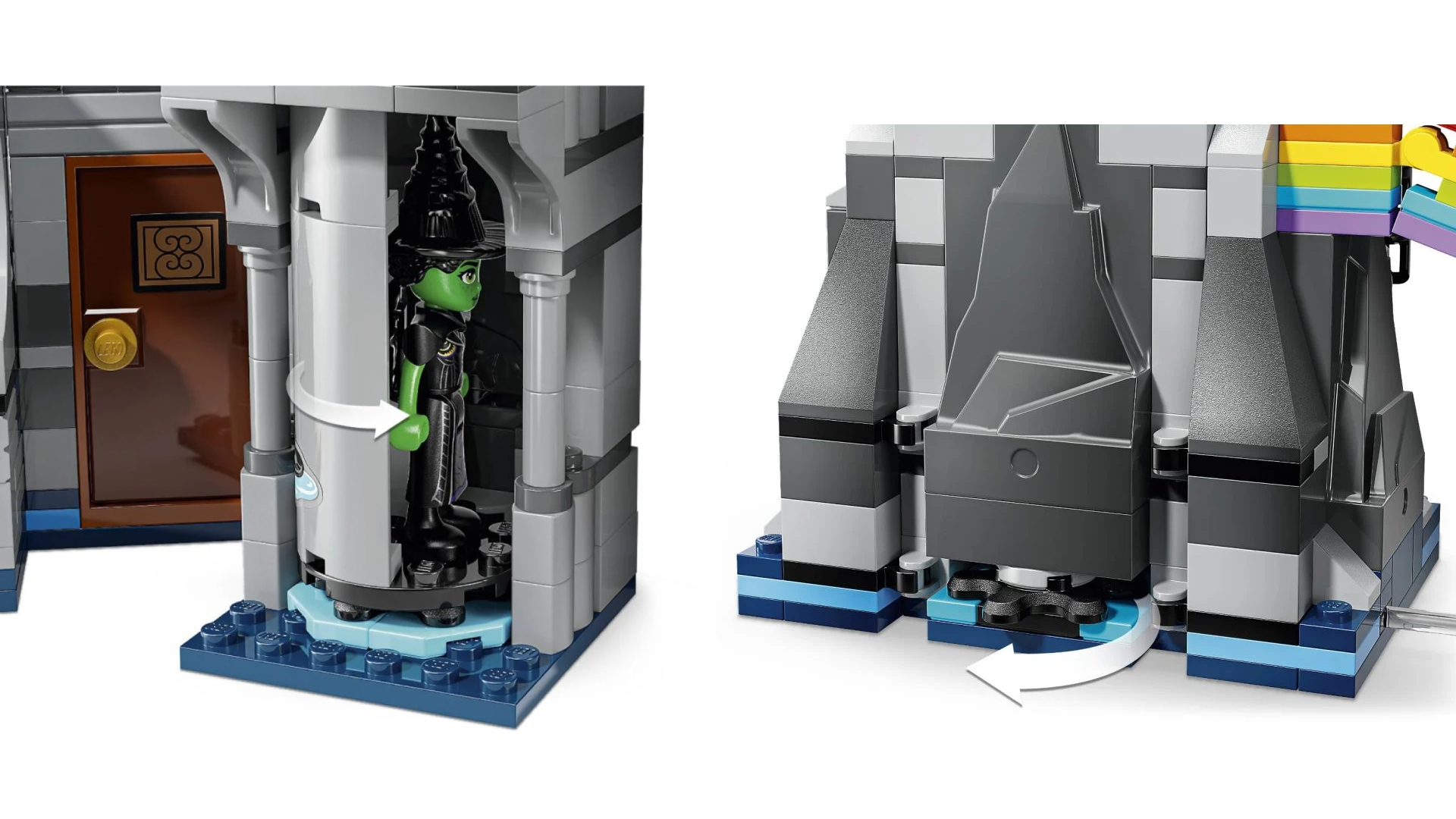 In Castelul Kiamo Ko pot citi cartea Grimmerie sau o pot ajuta pe Elphaba sa dispara in compartimentul secret pentru a-si urma destinul dincolo de curcubeul LEGO!