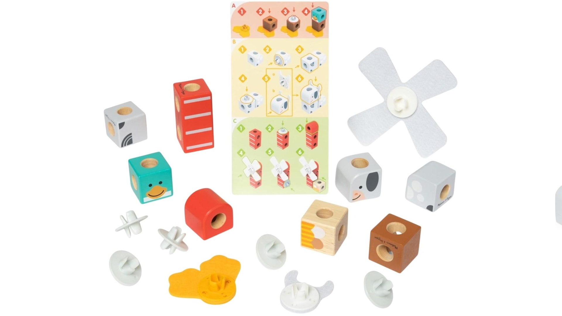 Setul include 16 piese, cum ar fi blocuri de lemn, conectori, coarne de capră din fetru, picioare de rață și o moară de vânt rotativă, permițând copiilor să creeze animale de fermă sau să-și inventeze propriile personaje.