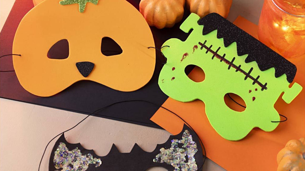 Creați-vă propriile măști: un dovleac, un liliac și un Frankenstein. Decupați măștile folosind șabloanele și apoi decorați-le, este atât de simplu.