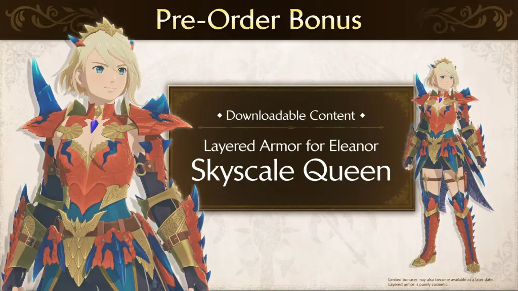 Bonusul de precomandă include: Armură stratificată pentru Eleanor: Regina Skyscale (*Armura stratificată este pur cosmetică.)