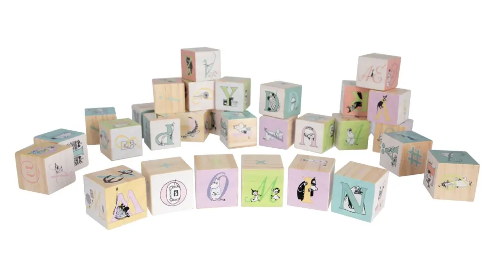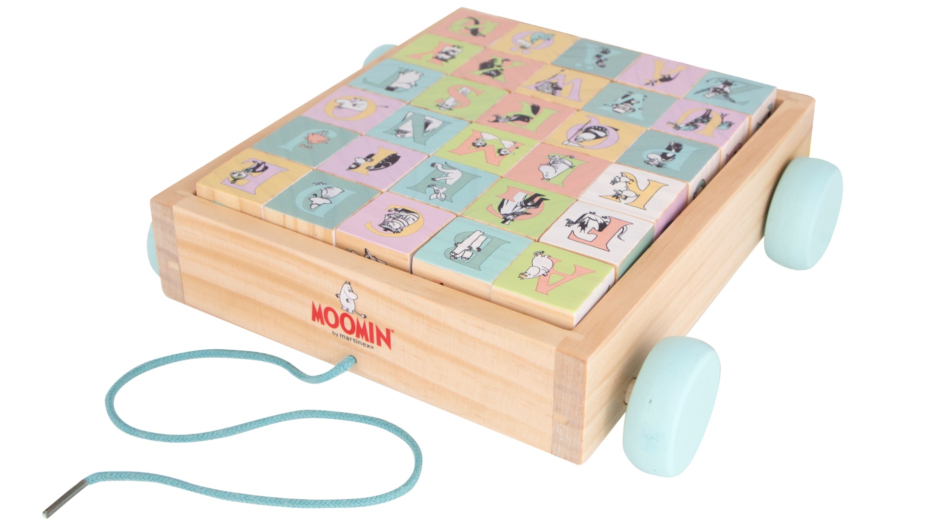 Căruciorul este umplut cu cuburi din lemn în culori pastelate cu literele, cifrele și semnele alfabetului, împreună cu figurine Moomin care se cațără, se târăsc și se joacă cu literele.