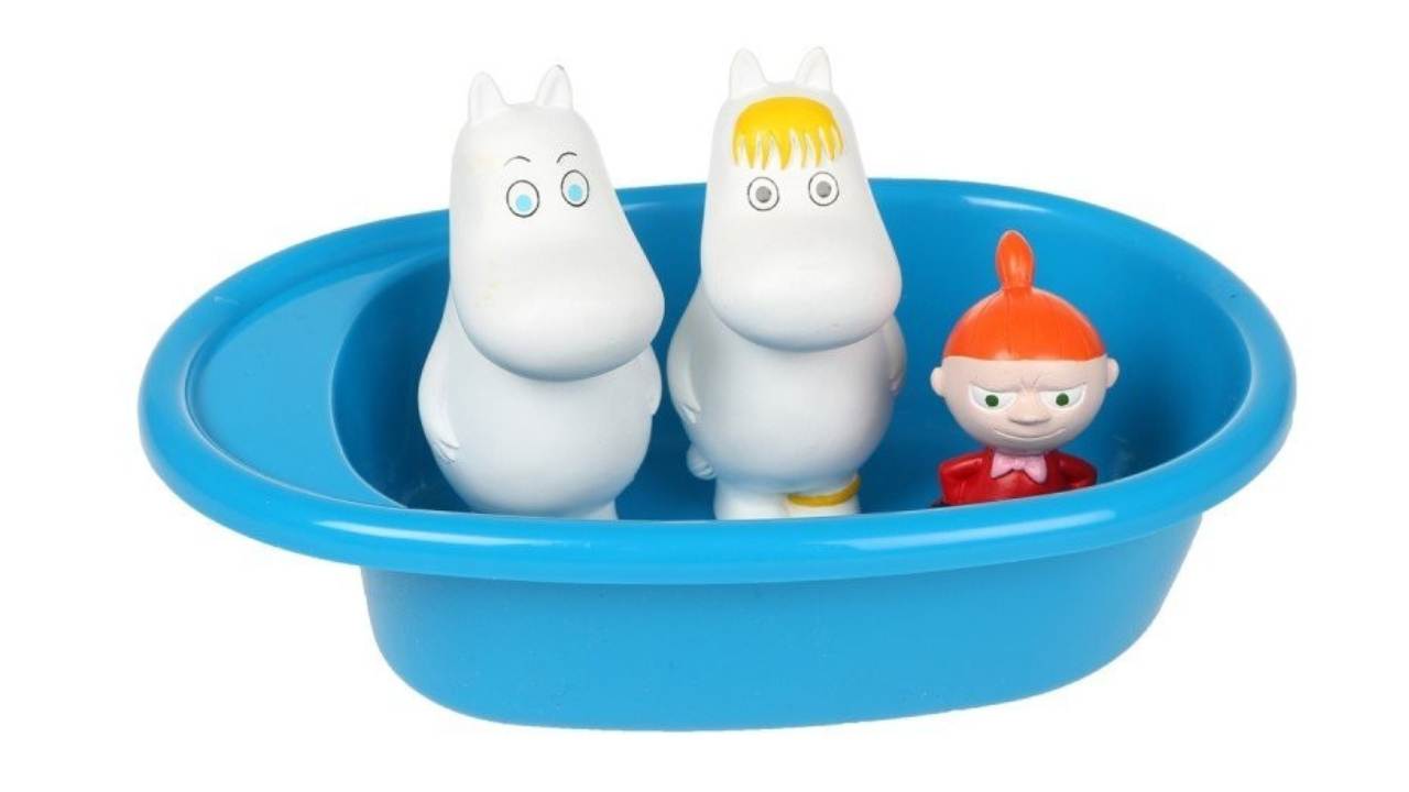 Un set de jucării pentru baie Moomin, care include o cadă mică din plastic și trei figurine: Moomintroll, Snorkmaiden (Niiskuneiti) și Little My (Pikku Myy).