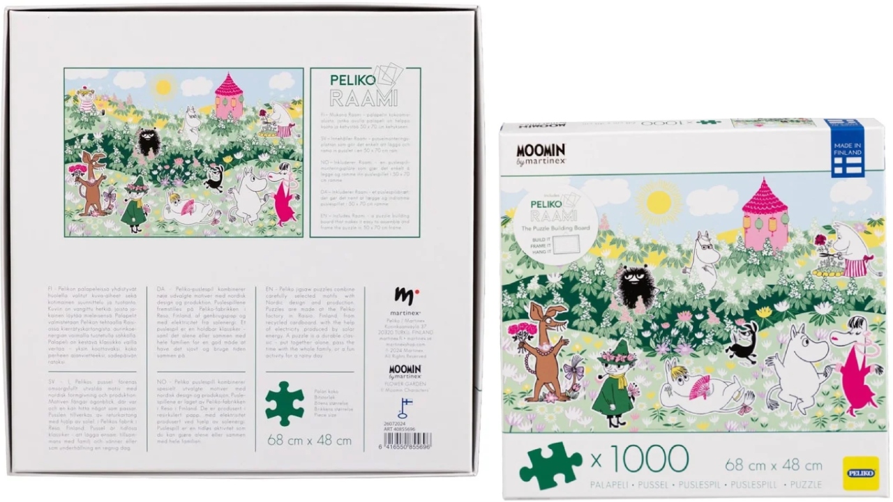 Puzzle-ul cu tematică florală a Muminilor are o imprimare cu personaje Mumini care se bucură de o grădină luxuriantă cu flori.