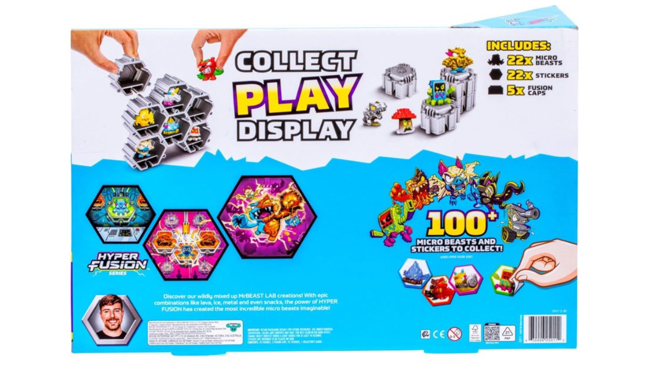 Fiecare pachet Fusion Chaos vine cu 22 de Micro Beasts, 22 de autocolante EPIC Hyper Fusion și 5 capsule Fusion suprapuse pentru a-ți construi propriul Laborator MrBeast.