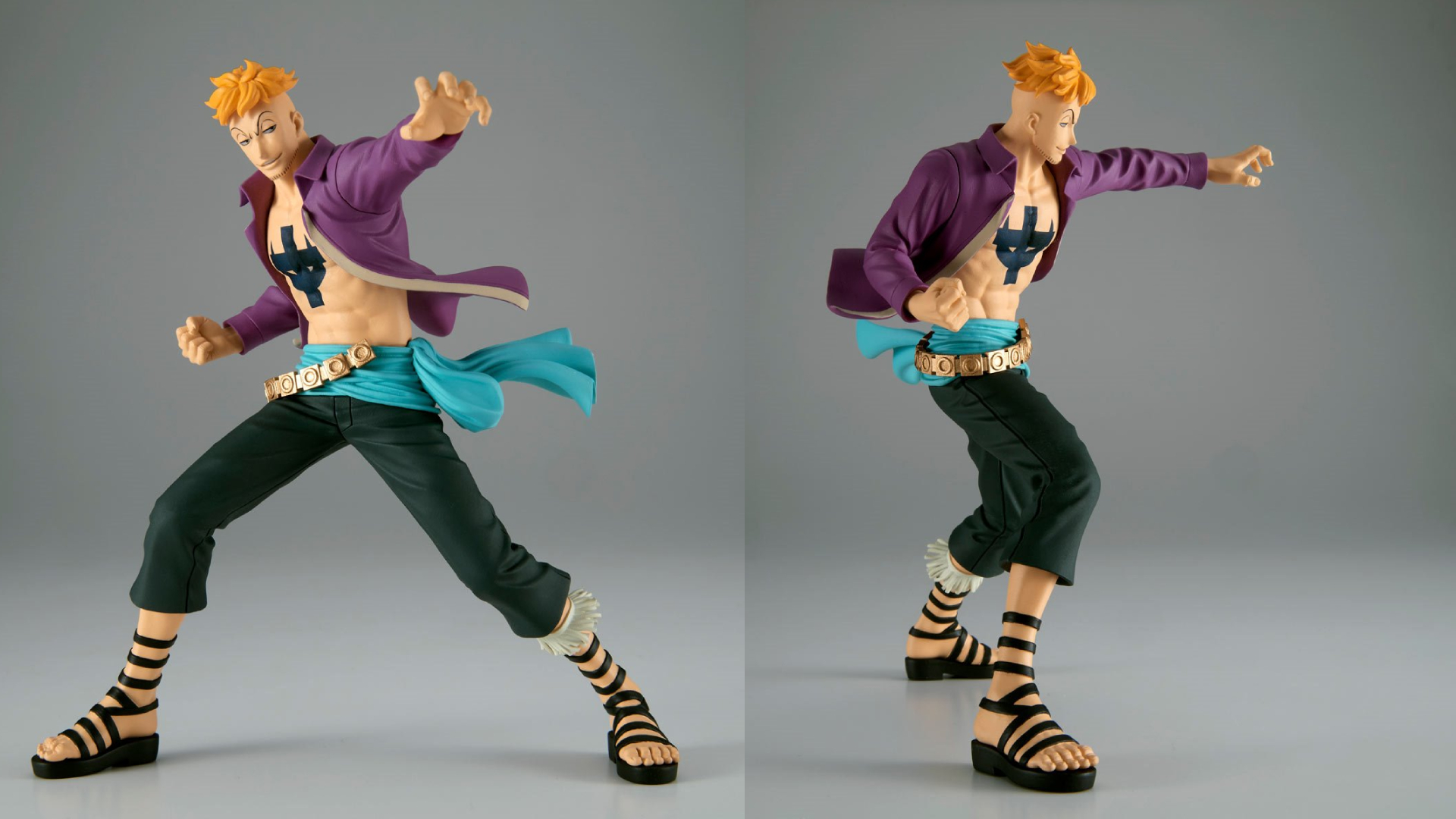 Îmbrăcat în cămașa sa iconică violetă deschisă, care îi dezvăluie toracele tatuat, și pantaloni negri cu o centură decorată cu detalii aurii, Marco este reprezentat cu mare fidelitate față de detaliile manga-ului.