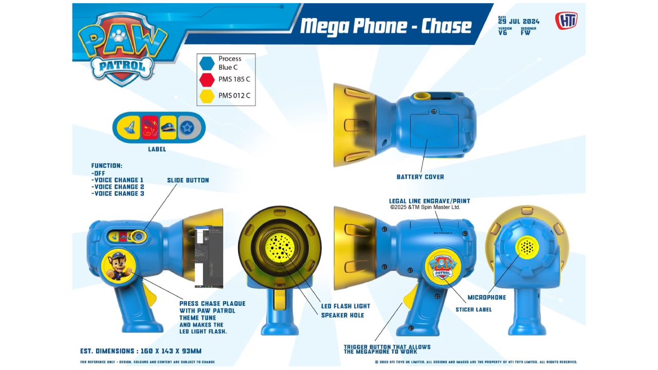 Acest megafon dispune de lumini, sunete și un schimbător de voce, perfect pentru micii fani ai Patrulei Cățelușilor care vor să se joace de-a eroii.