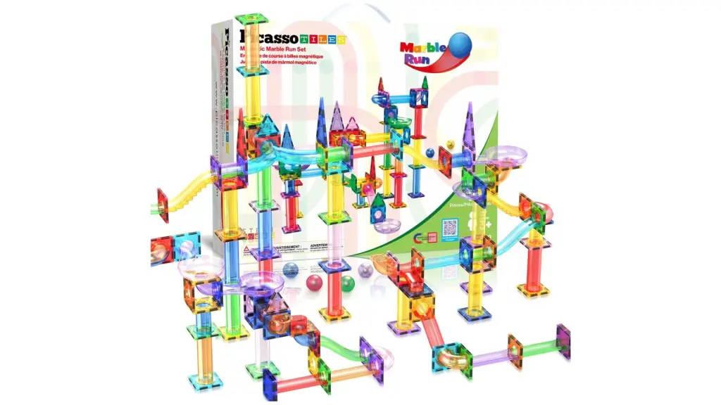 Acest set de piste magnetice cu bile, format din 150 de piese, include plăci translucide colorate, coloane, tobogane, forme de întoarcere în U, pâlnii și bile ponderate.