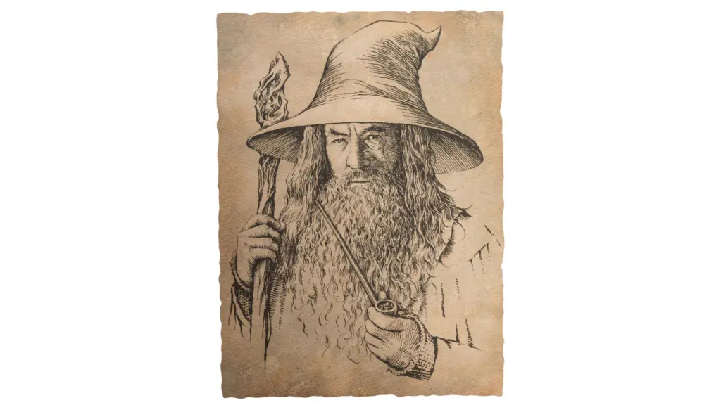 Această gravură minuțios detaliată a lui Gandalf cel Gri (asemănător cu Ian McKellen, care l-a interpretat pe Gandalf în filme) provine din penița inimitabilului artist și caligraf Daniel Reeve de la departamentul de artă 3Foot7.