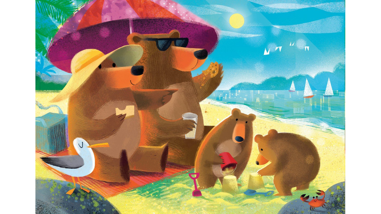 Care este locul tău de vacanță preferat? Familia de urși bruni petrece o săptămână la plajă, bucurându-se de soare și băuturi răcoritoare și gustări delicioase.