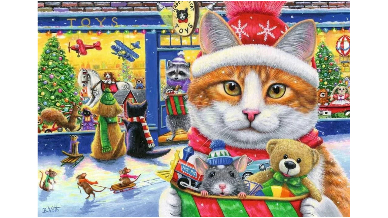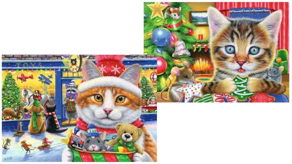Distrează-ți micuțul cu un set de puzzle-uri festive cu feline blănoase din puzzle-ul nostru „Pisicuțe de Crăciun” realizat de artista Bridget Voth!