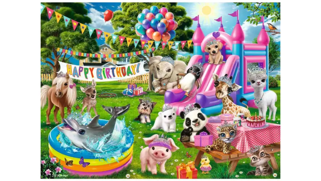 Oferă-i copilului tău un cadou cu multă distracție repetată cu acest puzzle Tiara Birthday Party, așezat sub soare!