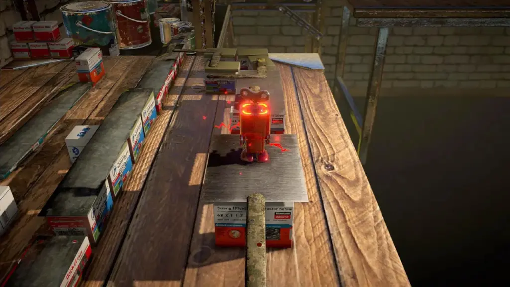 - Îndrăznește să pilotezi A-RED, mergând pe pământ sau în aer cu jetpack-ul său, pentru a descoperi toate surprizele ascunse în atelierul gigantic și haotic!
