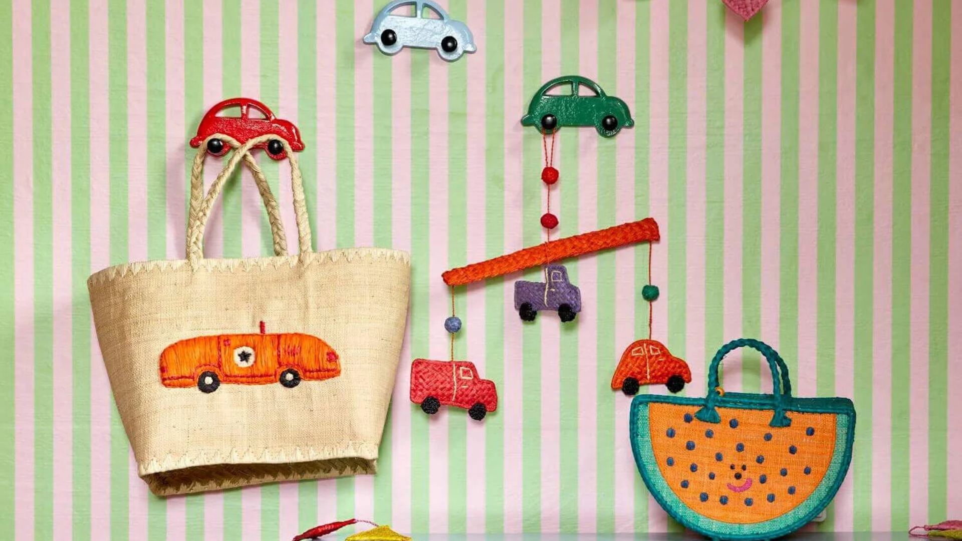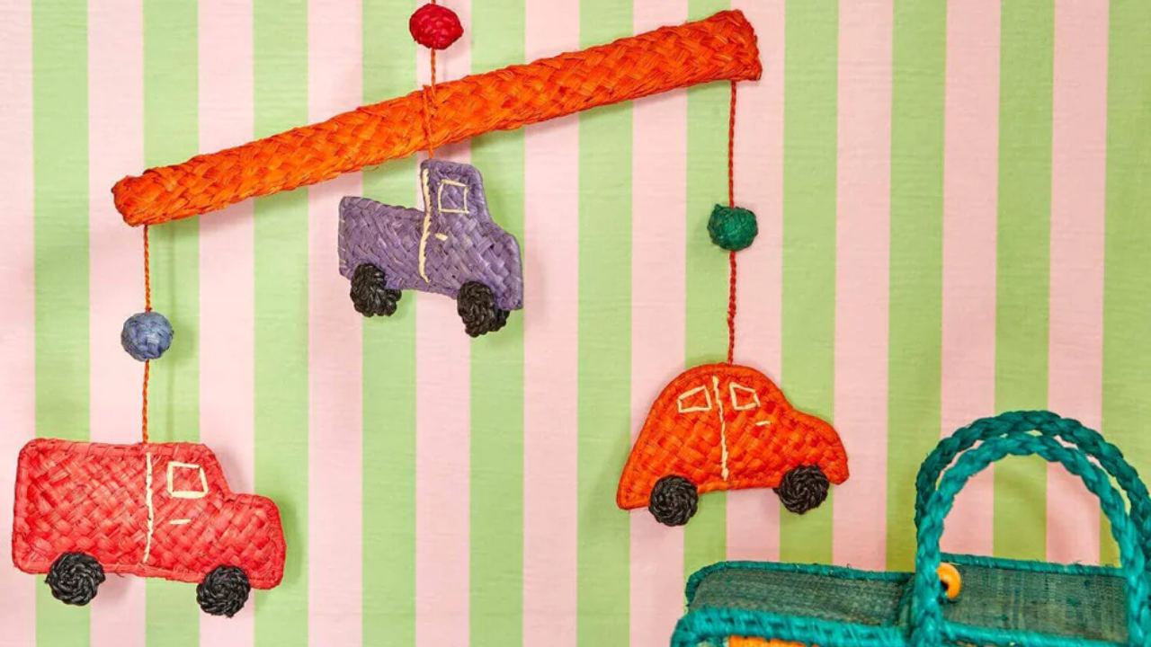 Adaugă o notă de farmec camerei micuțului tău cu această încântătoare decorațiune din rafie cu mașinuțe de la Rice.