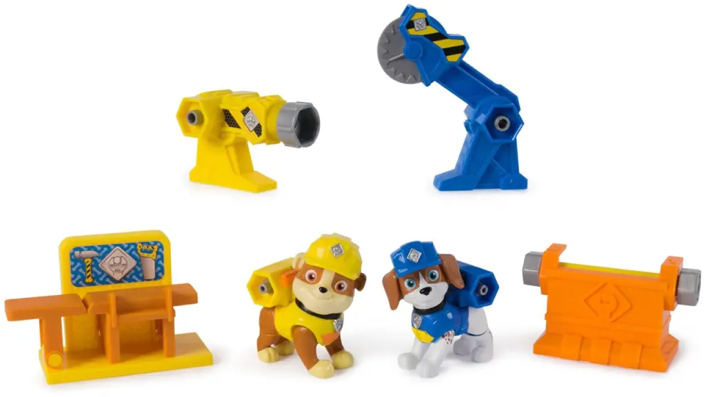 Pregătește-te să „Bow-Wow Build” cu cățelușul tău preferat PAW Patrol, Rubble și amicul său Wheeler în setul de figurine Power Tool Pups.